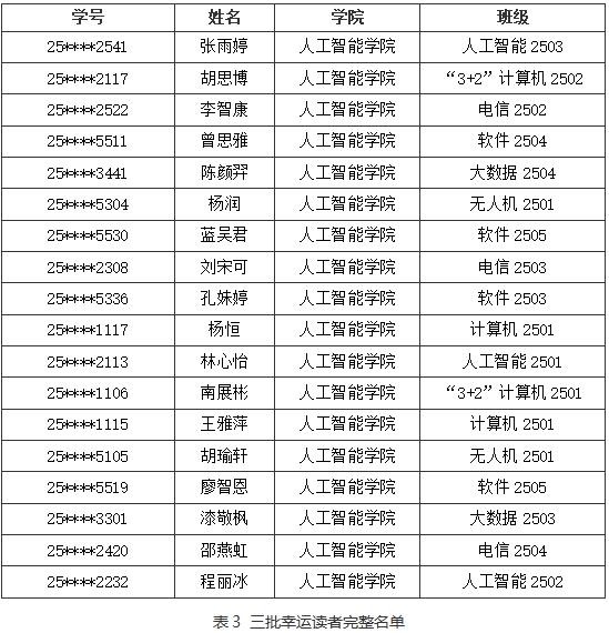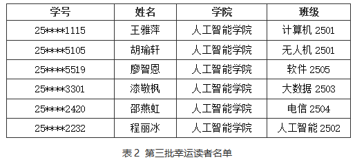 为鼓励全体新生扎实完成入馆教育自学任务,切实提升信息素养能力,我们分批次开展了3 轮入馆教育学习激励活动,目前三批幸运读者已全部产生。为便于各位顺利领取奖品,现将三批幸运读者完整名单予以公布(见表3)。请各位获奖新生仔细核对名单中的姓名、学号、所属学院及班级等个人信息,确保信息准确无误。