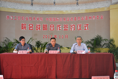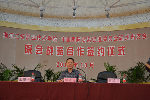 会议由张俊平副院长主持,贺星岳院长致欢迎辞,贺院长和温州贸促会蔡永旺书记代表双方签订“院会战略合作框架协议”。经贸学院与温州贸促会有关部门签订“温州贸促会国际商务信息服务平台建设”协议。同时,贺星岳院长向温州贸促会郑胜洁、钟国强两位专家颁发兼职教师聘书,向温州贸促会授以“浙江工贸职业技术学院国贸专业实习基地”牌。