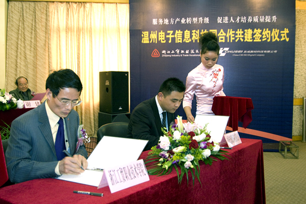 据悉,作为“三大园区”之首的温州电子信息科技园是由我院与中国·忠成数码科技有限公司共同组建。电子信息科技园主要由温州电子信息研究院、温州转型企业培育基地、温州电子信息技术交易中心、温州市大学生和海归留学生科技创业基地等部分组成。科技园发展的重点在于引进海内外高端研发设计团队和高端产品制造公司,先进的技术设备,科技园的建设将有利于带动温州市电子信息产业发展,进一步促进温州产业结构的转型升级,增强温州区域经济核心竞争力,从而创造温州经济发展新的增长点,同时服务于学院电子信息类、经贸管理类和设计类等专业,推动教学改革,为开展产学研合作教育提供广阔的平台。