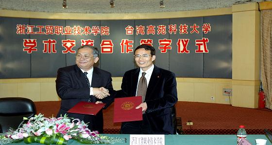 新春伊始,台湾高苑科技大学校长廖峰正教授一行应邀到我市的浙江工贸职业技术学院访问,就促进两校相互了解,加强交流,共同提高教育教学和科研水平进行研讨,浙工贸职业技术学院院长何向荣教授与台湾高苑科技大学校长廖峰正教授并共同签定有关协议,同意创建友好学校关系,并将根据学校的实际情况,促进两校在教学、科研领域与师资培育的学术交流与合作。
