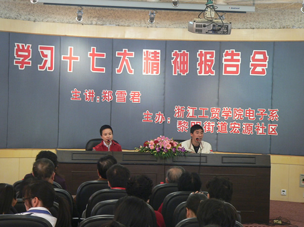 在全社会掀起学习十七大精神的浪潮中,11月24日上午9点,温州市十七大代表、温州总编助理郑雪君来到浙江工贸学院多功能厅,为浙江工贸学院的学生和宏园社区的党员奉献了一场精彩的报告会。