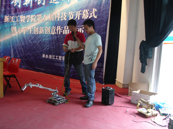 在大学生创新、创意科技作品展示会上,来自全院六个系的8名同学展示了各自的作品。轻工系吴青老师展示的是其学生的作品《废品回收再利用》,该科技作品主要是利用废旧的物品制作工艺品,达到废物利用,有环保的价值和意义。汽机系的陈华同学展示的是数学建模《高校合理计划招生模型》,该模型对高校如何根据自身的资源条件进行招生有一定的指导作用。轻工系的丁鑫娜同学展示了科研作品:《个性化板材架设计方案》。该作品中展示了近20余副学生创作的眼镜架作品,这些作品包含不同的概念和设计元素,充分展现了学生的想象能力和扎实的专业基础。信息系黄士俊同学的《公寓管理系统软件》从实际出发,解决了公寓管理中的各种难题,深受有关工作人员的好评。电子系杨亮同学的科研作品《货物搬运机械手PLC控制》展示的是利用机械手代替人工搬运货物的机械功能。另外,汽机系王文中同学展示的作品《人质解救机器人》和创业园杨锦伟同学展示的《学生综合考品系统》也有较高的科技含量,受到了师生的好评。