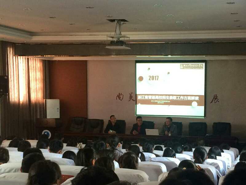 在泰顺城关中学,蔡景界副处长为在场的120多位学生解读了2017年高考招生录取工作方案,对学生填报志愿做了有效指导,并简要介绍了我院的专业设置以及我院服务学生全面发展的具体举措。随后,万登泸书记推介了材料工程系的特色专业,颇具故事性和小清新风格的专业宣传视频引起了在场学生的共鸣。最后,该校林美春副校长充分赞扬我院的教学成效,并鼓励学生报考我院。会后,许多学生仍留在会场,咨询有关提前招生专业和综合测评方式等问题。