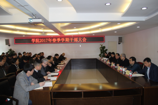 2月13日上午,学院召开2017年春季学期干部大会,同时进行学习贯彻十八届六中全会精神轮训活动专题报告,以及开展对换届后新一届干部的集中谈话。学院党政工学班子成员和全体中层干部、以及党总支、直属党支部书记参加了会议,会议由学院党委书记盖庆武同志主持。