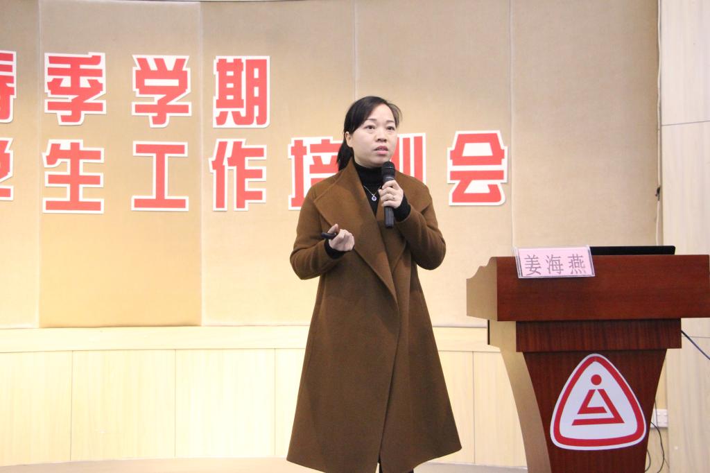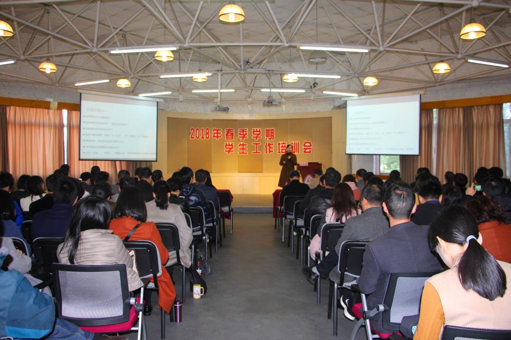 3月1日上午,2018年春季学期学生工作专题培训会在多功能厅举行。各分院(系)书记、辅导员、全体班主任及学生处全体人员参加了会议。会议分两个阶段进行,第一阶段由温州大学步青学区党委书记、主任姜海燕做题为《“教练技术”在学生工作中的应用》的讲座,第二阶段由二级分院(系)就学生工作进行主题交流以及本学期学生工作的相关部署。会议由学生处处长林海春主持。