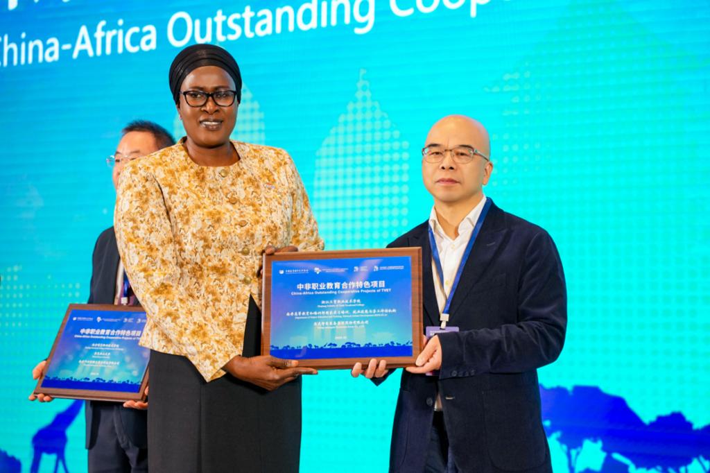 本次会议由中国教育国际交流协会、非洲技术与应用型大学和学院协会、联合国儿童基金会驻华办事处共同指导,金华市人民政府和浙江省教育厅联合主办。学校副校长汪焰受邀出席会议并参与成果发布环节。会上,非洲技术与应用型大学和学院协会秘书长扎哈·法勒向我校等入选单位授予“中非职业教育合作特色项目”牌匾。