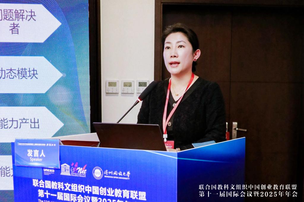 新未来数字集团副总裁林红霞以《AI时代产教融合提升大学生创新创业质量的路径研究》为题,提出在AI加速岗位重构的背景下,应构建“点—链—网—场”四维融合模型,推动从“知识传授”向“人机协同”育人范式转变。