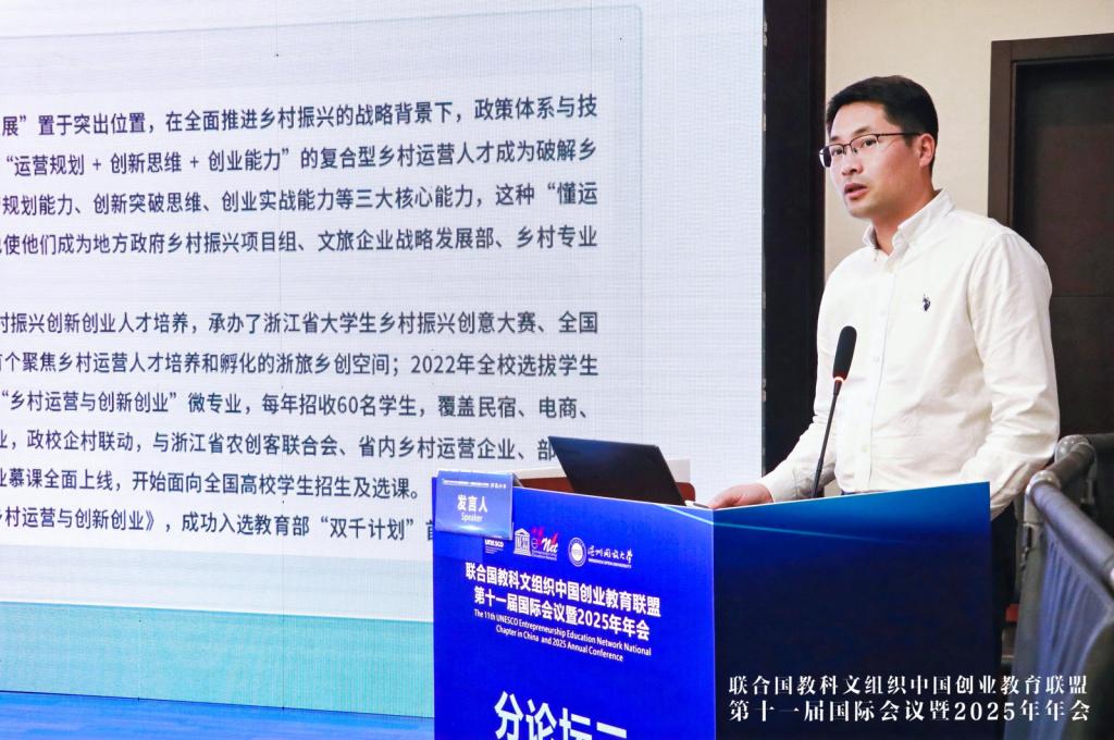 浙江旅游职业学院教务处处长、产教融合办主任沈鑫泉以《乡村运营与创新创业》为题,介绍了全国首个“乡村运营与创新创业”微专业建设路径,通过“6+1”课程体系与政校企村联动机制,培养懂运营、善创新、能创业的乡村复合型人才。