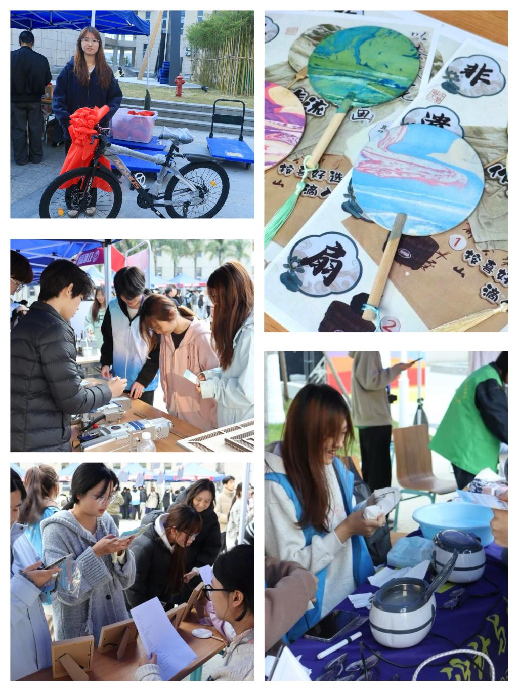 广场上,五大主题团的展示各具特色:智创先锋团的3D打印作品、无人机表演展现了科技魅力,激发学子探索创新的热情;焕新生活团的眼镜清洁、职场简妆等服务贴近生活,传递了“劳动创造美好生活”的理念;燃动青春团的运动指导与体能训练,引导学子树立健康生活观念;创艺工坊团的蓝夹缬、手工漆扇等传统工艺展示,让学子在体验中感受传统文化魅力;文韵同行团的书法展示、方言游戏则丰富了文化体验,增强了文化自信。互动游戏区的汉服体验、成语比拼等项目,更是吸引了众多学子参与,在欢声笑语中传承文化、增进友谊。