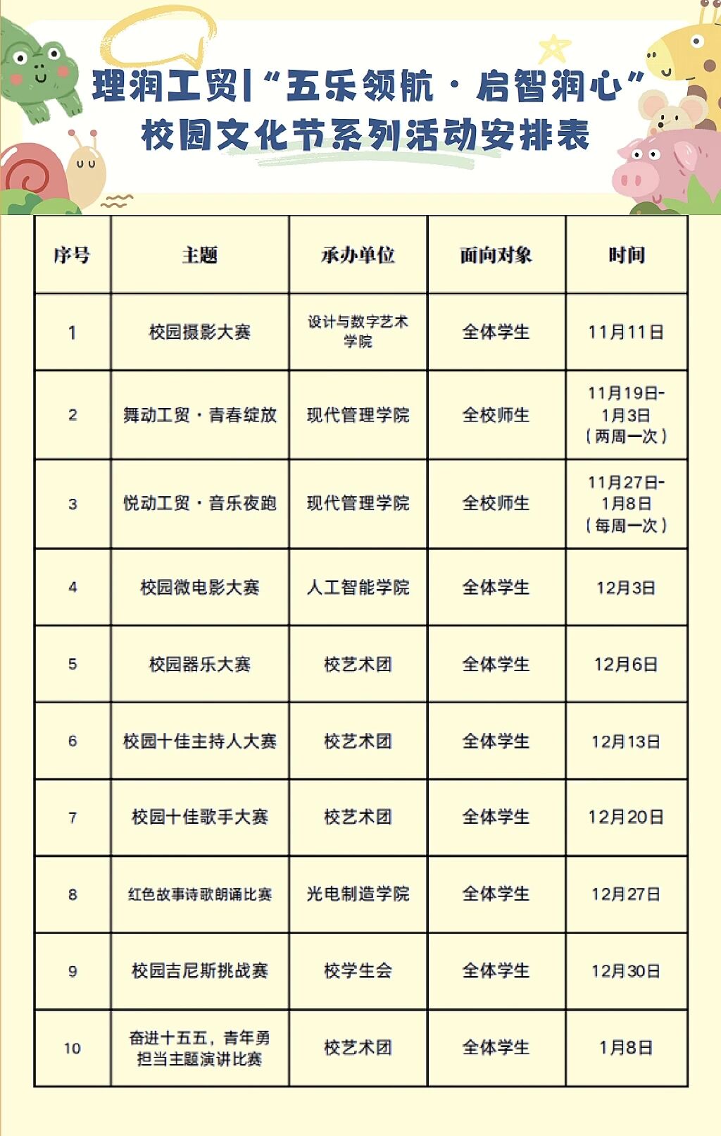 据悉,本次校园文化节系列活动将从11月持续至次年1月,涵盖摄影大赛、音乐夜跑、微电影大赛、器乐大赛、红色故事朗诵等十余项主题活动,以及“青春UP课堂”系列培训活动,内容丰富、形式多样,为学子提供了展示自我、提升素养的广阔平台。