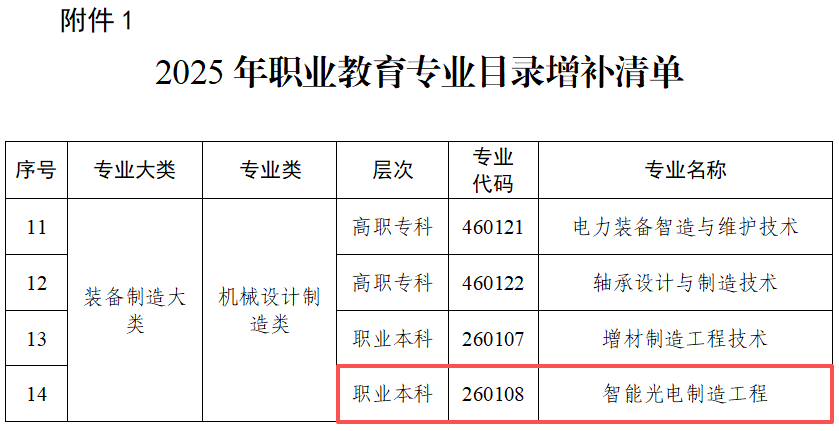 近日,教育部办公厅发布《2025年职业教育专业目录增补清单》,浙江工贸职业技术学院牵头申报的“智能光电制造工程”专业(专业代码:260108)成功入选,成为职业本科的新增专业之一。该专业的增设,标志着学校在深化产教融合、服务国家战略及区域产业发展上迈出关键一步,更为区域高端装备制造领域高端技能人才培养提供有力支撑。