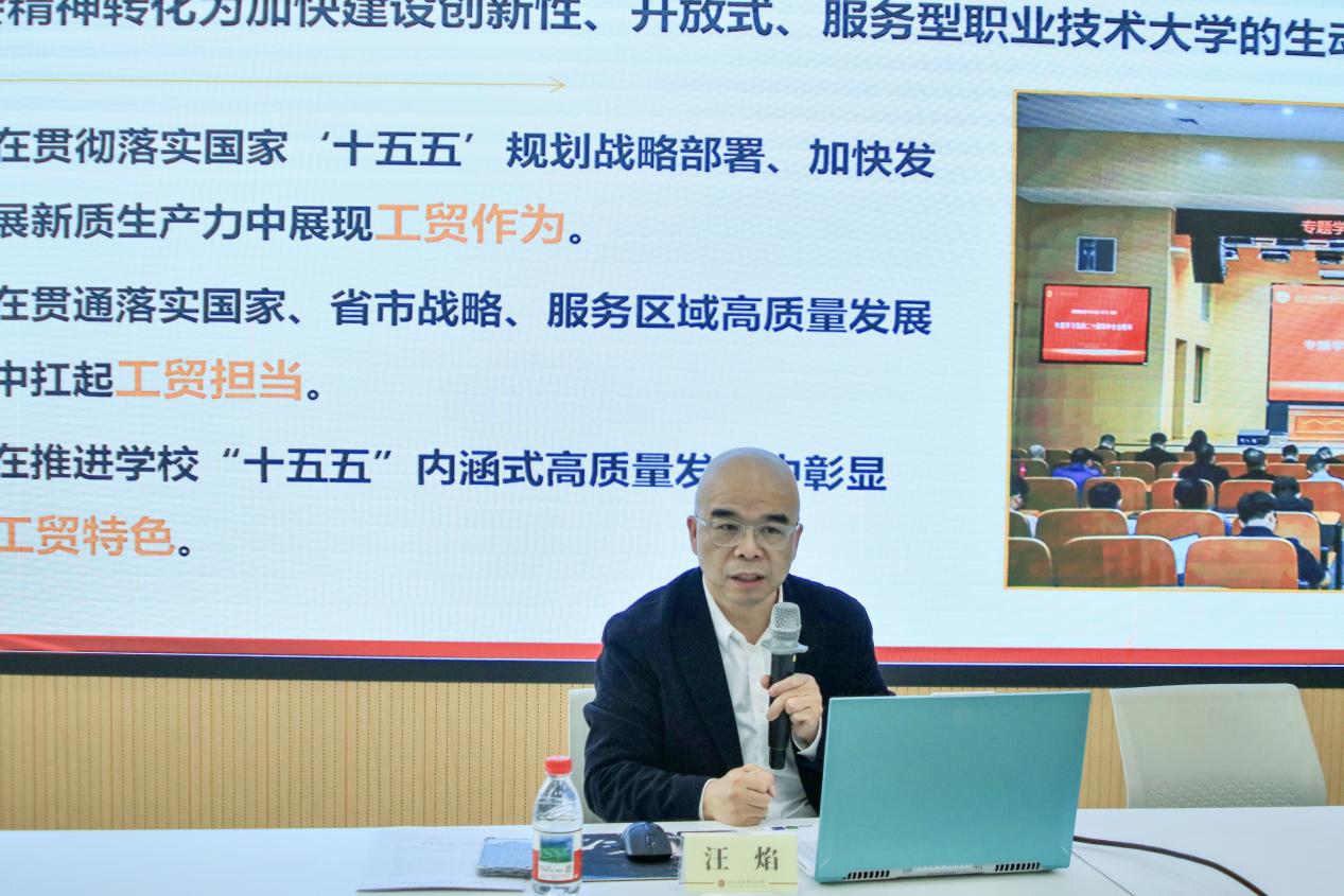汪焰结合学校实际,指出要将学习宣传贯彻党的二十届四中全会精神作为当前和今后一个时期的重大政治任务,切实把全校师生的思想和行动统一到习近平总书记重要讲话精神和党中央决策部署上来,将全会精神转化为加快建设创新性、开放式、服务型职业技术大学的生动实践,在贯彻落实国家“十五五”规划战略部署、加快发展新质生产力中展现工贸作为,在贯通落实国家、省市战略、服务区域高质量发展中扛起工贸担当,在推进学校“十五五”内涵式高质量发展中彰显工贸特色。