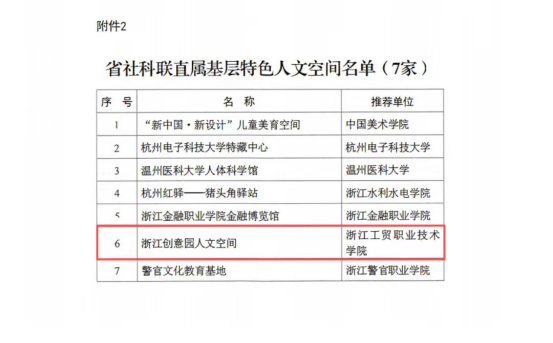 根据浙江省社会科学界联合会《关于公布2025年度基层特色人文空间名单的通知》文件精神,经专家评审与省社科联党组研究,我校浙江创意园成功入选省社科联直属基层特色人文空间。