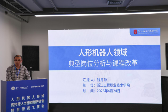 会上,我校人工智能学院副院长钱月钟围绕“人形机器人领域典型岗位分析与课程改革”相关主题作了交流汇报,系统性介绍了学校在对接人形机器人产业链、分析典型岗位任务、推动课程体系与教学内容重构方面的探索与实践。发言得到了与会专家和兄弟院校的积极反馈,充分展现了我校在服务新质生产力发展、深化产教融合方面的主动作为和专业能力。