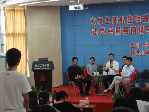 此次职业生涯规划大赛动员和赛前培训会上还引入了沙龙形式的讨论,职业生涯规划大赛获奖同学张成和陈亮亮同学分别从创业组、职业组的不同参赛经历,向同学们介绍了比赛经验,还鼓励参赛的同学们不要害怕麻烦、要敢于一遍一遍的去修改和纠正不足,要虚心听取指导老师的意见,相信通过多次修改每一个人都会对自己有个清楚的认识和准确的职业生涯定位。职业生涯规划指导老师丁崴老师表示张成、陈亮亮同学确实是在投入了很多的时间和精力后才取得了这样的成绩,同时他们在情景答辩、现场模拟环节都给出了一个生动、入人心的回答或者设计方案,同学们一定要抓细节、注技巧、有创意。第三届浙江省职业生涯规划评委夏铭老师从省赛评委的角度要求告诉同学们用一种慎重、认真、专业、乐观的态度去参加职业生涯比赛,并系统的向同学们说明了他们希望看到的是一份什么样的职业生涯规划书。