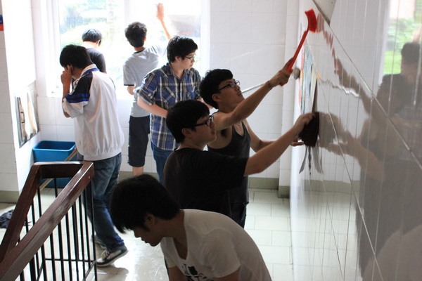 5月15日中午,学生公寓C幢由高职、成教、技师学院的学生党员、建党对象,院宿管会楼层长和纪检部等30多名同学组成的青年志愿者在公寓辅导员徐剑敏、薛明银、管理员余非老师带领下,开展“明德修身,我爱我家,美化公寓环境”活动,大家一起在C幢学生公寓进行擦洗玻璃、瓷砖,清理蜘蛛网,清扫通道和楼梯、清洗卫生间等,为同学们带来舒适的居住环境,创造优美的校园环境。