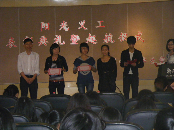 10月11日晚上,经贸学院学生党支部在学院多功能厅举办了“阳光义工表彰典礼暨起航仪式”活动,邀请了经贸学院党总支书记项光春、学生党支部书记郑秀、白福川、朱杨琼、叶丹丹以及辅导员向政和温州实艺幼儿园和温州小蜜蜂幼儿园的代表出席了本次活动。