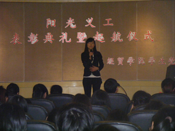 活动伊始,多功能厅的两个屏幕上出现了经贸学院大二、大三的志愿者上学期在实艺幼儿园和小蜜蜂幼儿园做义工的点滴画面,无数令人怀念的照片使得整场活动一开始就被推上了一个制高点。同时,实艺幼儿园的代表和项书记分别作了讲话,表示双方能建立长期实践基地合作关系,认可了志愿者的优秀表现。随后,优秀志愿者代表纷纷上台与大家分享他们在做义工期间的真情感人事件。最后,随着歌声响起,伴着起航信物在全场学生间的传递,此次活动顺利落下了帷幕。