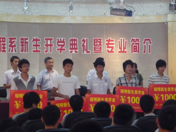 会议首先举行了“瑞明新生奖学金” 颁发仪式。该奖学金是由温州瑞明工业股份有限公司赞助,奖励给第一志愿报考材料工程与管理专业且成绩排名前五的同学。接着新生代表和教师代表分别做了发言。材料工程系副书记杨晓珍老师以“Why?What?Where?When? How?”为主题,紧扣“我们为什么要到大学里来、“我们到大学里来寻找什么、这里是什么地方和你将来准备去什么地方、你拥有多少时间和机会以及怎样度过我们的大学生活和实现我们的人生目标”五方面内容,以设问的方式给新生上了一堂生动的教育课。