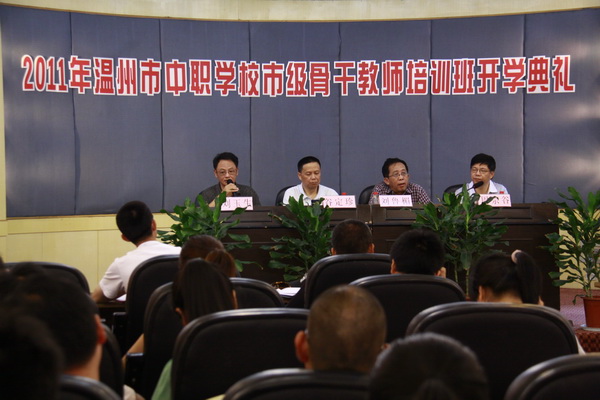 2011年温州市中职学校市级骨干教师培训班开学典礼于7月8日在学院多功能厅举行。参加本期培训的中职教师将近100 人,分别来自温州地区的各中职学校。培训从7月8日至22日为期15天,培训类别有通识(现代信息技术应用)、计算机程序设计、汽车检测与维修,其中计算机程序设计、汽车检测与维修可参加国家职业资格鉴定考试(高级、技师)。
