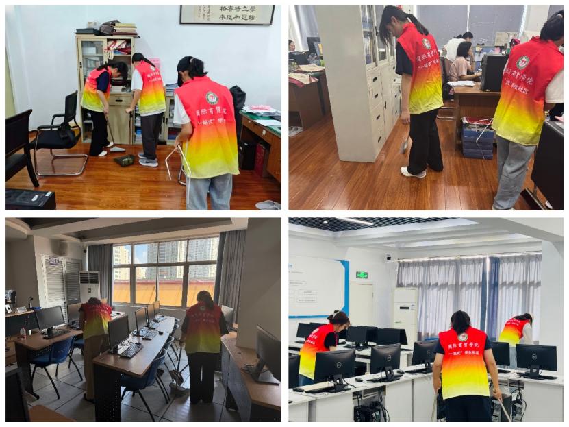 与此同时,在社区服务中心办与三号楼机房内,志愿者们认真清理每一个角落,以细致负责的态度优化办公与教学环境,为师生群体营造了更有序的工作和学习空间,也让机房焕发新的活力。