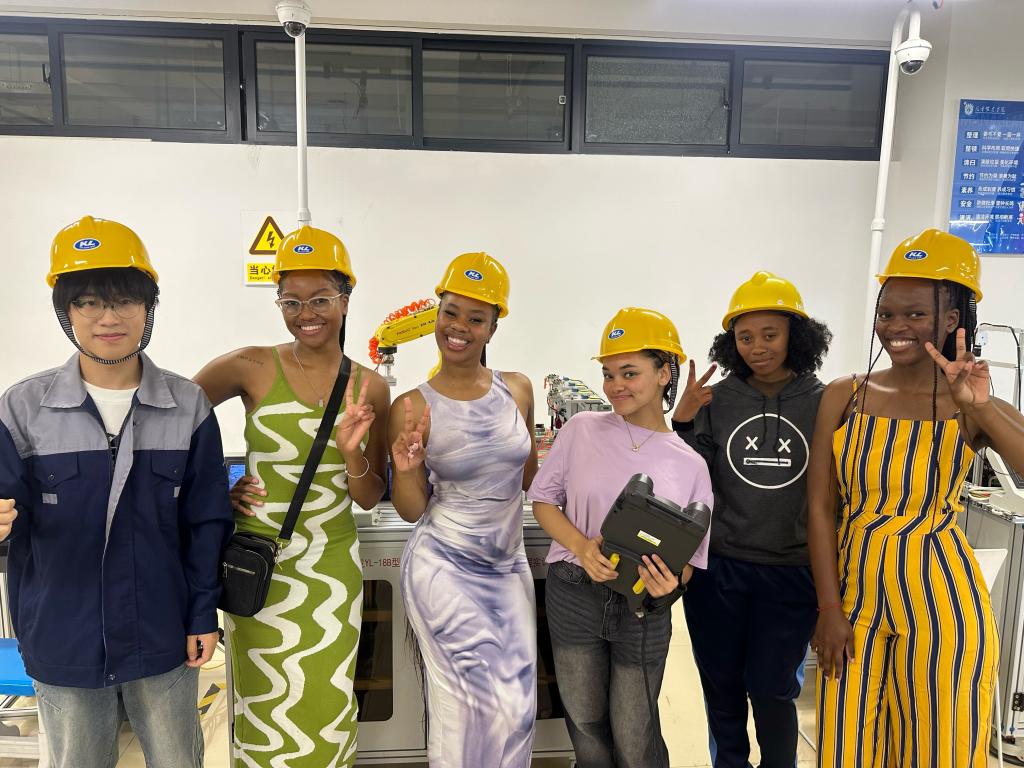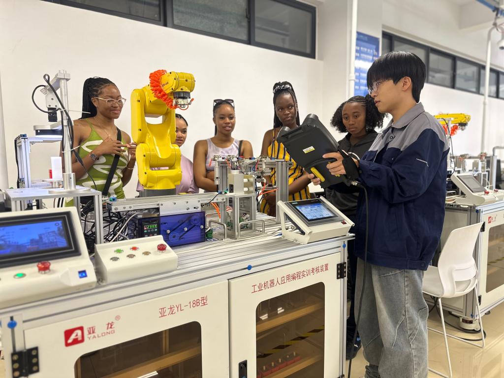 “这是工业机器人机械臂,能完成精准的焊接、装配工作;旁边的仿真系统可以模拟实际生产场景……”10月27日下午,瓯江口校区工业机器人实训车间内,志愿者为南非工业机器人专业的学子们详细讲解设备功能。同学们围在机械臂旁,认真听讲解、记参数,不时伸手触摸设备外壳,眼神里满是好奇。“可以让机械臂演示一下吗?”SEABI忍不住提问,老师立刻操作设备,机械臂灵活地拿起零件、完成组装,引得大家阵阵惊叹。“太神奇了!这些设备比我在南非见过的更先进。”SEABI说,这次参观让他对专业学习充满信心,“以后一定要好好学,掌握更多技术!”