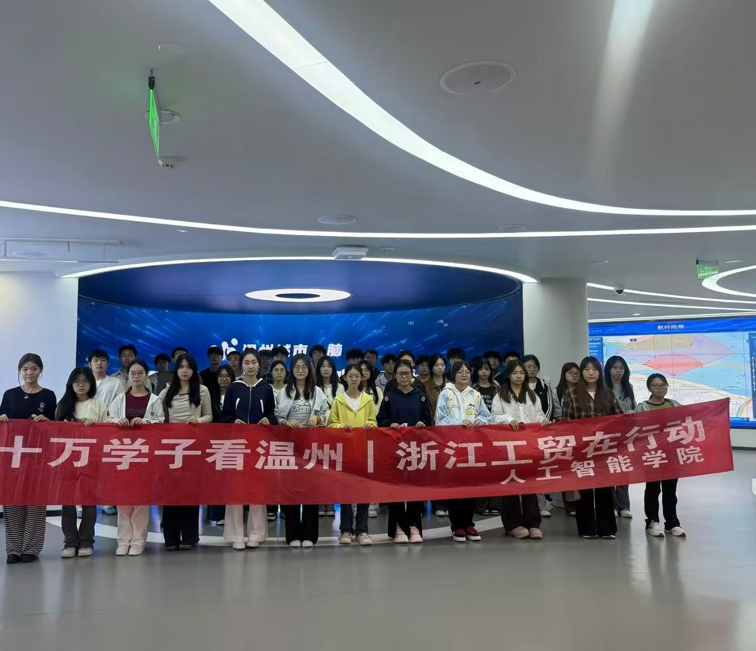 为使2025级大数据技术专业新生直观感受数据技术在城市治理中的前沿应用,近日,人工智能学院组织大数据专业新生前往温州城市大脑运营指挥中心开展认知实践活动。大数据技术专业教师陈兵国、实训指导教师项云淋与辅导员翁昭昱共同带队,与新生一同走进这座承载着温州数字化改革成果的"城市智慧中枢"。