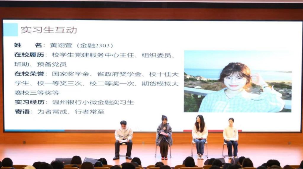 在实习生互动交流环节,四位金融专业优秀学长学姐作为“过来人”分享实践成长故事。郑欣怡、邱欣鑫结合在中国太保产险温州分公司的实习经历,讲述了客户沟通、业务处理的经验;黄翊萱与王俊航则分享了在温州银行参与信贷辅助与客户分析的实战体会。互动提问环节气氛热烈,新生围绕学业规划、证书考取、实习准备等踊跃提问,学长学姐结合自身经历细致解答,让新生对未来学习与职业发展有了更具体的认知。
