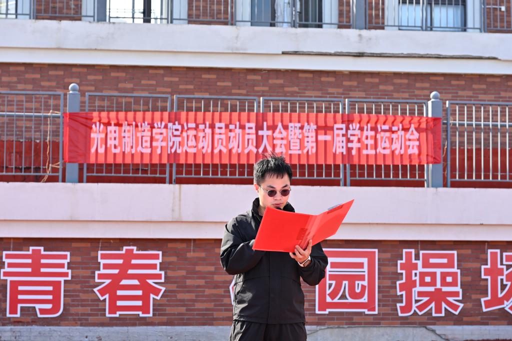 在开幕式上,陈磊老师寄语全体光电学子:体育不仅是力量与速度的比拼,更是意志的磨砺和精神的洗礼。他回顾了往年赛场上那些咬牙坚持、默契配合、相互鼓励的动人瞬间,勉励大家以“安全第一、友谊第二、比赛第三”为准则,在此次运动会中尊重规则、尊重对手,全力以赴、奋勇争先。他希望同学们将赛场上的拼搏精神延续到学习与生活中,用团结、坚韧与热爱书写属于光电学子的青春华章。