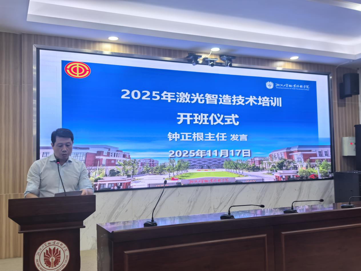 2025年11月17日上午,由浙江省总工会主办,温州市总工会、浙江工贸职业技术学院(温州市劳模工匠智能制造产业人才学院)承办,浙江省激光智能装备技术创新中心、温州市激光行业协会协办的“2025年激光智造技术培训项目”在学校瓯江口校区正式开班。来自全省20多家企业及院校的36名学员,将围绕激光智能制造技术、激光智能装备结构及功能、激光智能装备装调(虚拟仿真)、激光制造工艺技术、激光精密制造技术等内容开展为期5天的集中培训。浙江工贸职业技术学院光电制造学院(温州市劳模工匠智能制造产业人才学院)院长郑道友,智能光电制造技术专业主任钟正根参加本次开班仪式。开班仪式由光电制造学院副院长金露凡博士主持。