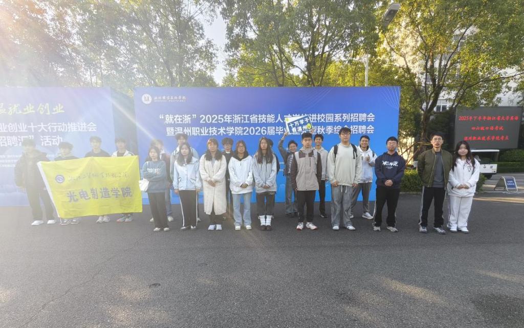 为深入贯彻落实“十万学子看温州”行动要求,推动毕业生高质量就业,拓宽光电学子的职业视野与发展机遇,2025年11月22日上午,浙江工贸职业技术学院光电制造学院受邀组织20余名学生前往温州职业技术学院,参加“就在浙”2025年浙江省技能人才岗位进校园系列招聘会暨温州职业技术学院2026届毕业生大型秋季综合招聘会。本次招聘会汇聚了240余家上市公司和行业领军企业参与,为学生搭建了丰富的就业渠道与实践平台。