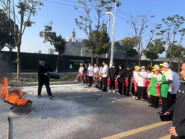 理论讲解结束后,全体参训人员移至空旷场地,在安保部专业人员的指导下,开展了灭火器实操演练。大家轮流上场,亲身体验了如何正确使用干粉灭火器扑灭油盆火。整个过程组织有序,参训人员踊跃参与,动手能力得到了有效提升。