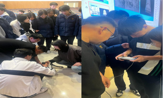 随后的实践环节,王凯老师和符洪姿老师先将机器狗放在展示区,向围拢过来的学生介绍:“这只机器狗的所有动作,都是通过软件编程实现的,它的大脑里存储着我们编写的控制程序,大家现在看到的前进、转弯、跳跃,背后都是代码在指挥。” 随后,符洪姿老师操作连接机器狗的平板,现场演示。随着手指在屏幕上点击指令,机器狗先是平稳前进,接着灵活转弯,还完成了上台阶等动作,引得学生们发出阵阵惊呼。
