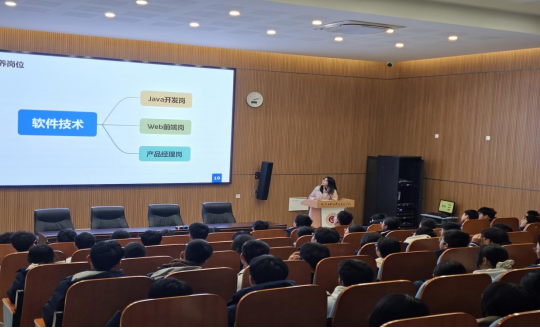 活动伊始,程书玲老师围绕软件技术专业展开系统讲解,从核心课程体系到职业发展路径,层层递进地为学生们揭开软件行业的神秘面纱。她介绍到,专业核心课程涵盖程序设计基础、Web 前端开发、数据库应用与软件测试等实用内容,始终以“技术实战型”人才培养为核心,紧密对接行业发展需求设置岗位分流。学生可根据兴趣与能力,选择 Java开发和web前端开发两大大方向深入学习,分别对应互联网企业、Java 开发工程师、前端工程师、测试工程师等岗位。同时,程老师还讲解了毕业生升学(专升本可报考计算机科学与技术、软件工程等专业)、就业路径。