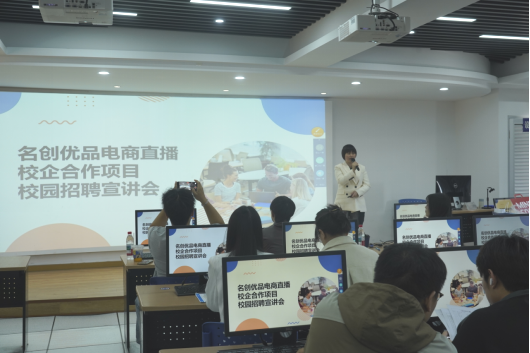 2025年12月1日下午,名创优品服饰配饰温州分公司电商直播校企合作项目校园招聘宣讲会在浙江工贸职业技术学院府东路校区成功举办。本次活动吸引了电子商务、商务数据分析与应用等专业近百名学生参与,现场气氛热烈,互动积极。