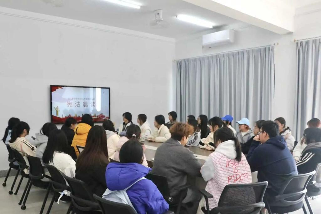 宪法是国家的根本大法,是治国安邦的总章程。为深入学习宣传宪法知识,厚植青年学生的法治信仰,弘扬宪法精神,增强学生的法治观念和公民意识,营造全员尊法学法守法用法的浓厚校园氛围,现代管理学院团总支学生会在青年之家精心开展宪法晨读活动,35名同学齐聚一堂,在庄重的学习氛围中感悟宪法力量,践行法治精神。