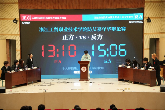 为了让同学们有更深刻的体验,浙江工贸职业技术学院辩论队与温州医科大学仁济学院辩论队特地联合举办了一场围绕“艾滋病防治与医学伦理——探讨患者权益与公共卫生安全的平衡”为议题的“艾辩飞扬”杯辩论比赛。