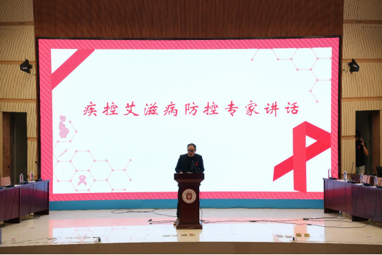 在资讯楼报告厅内特邀疾控中心艾滋病防控专家陈庆亨为同学们进行有关艾滋病防范的宣讲。