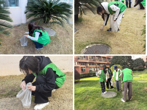 活动开始前,志愿者统一着装、精神饱满,在指定地点集合。同学们手持清洁工具,按小组有序前往E幢与F1幢学生宿舍周边及楼道公共区域开展劳动。