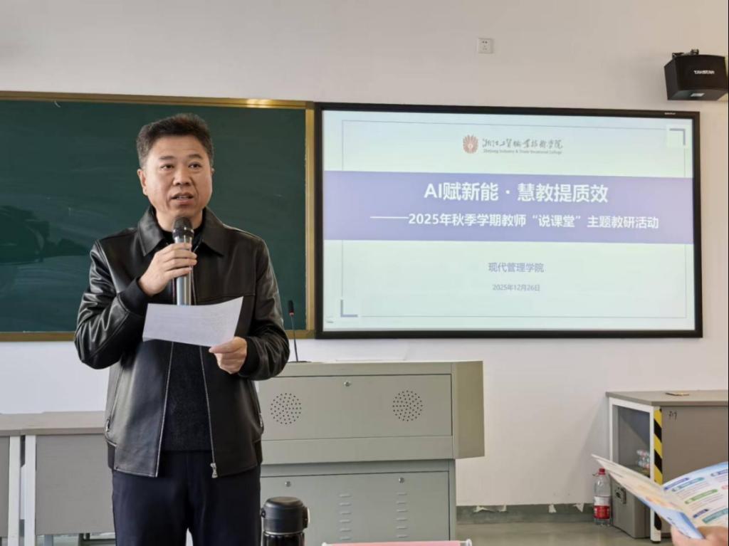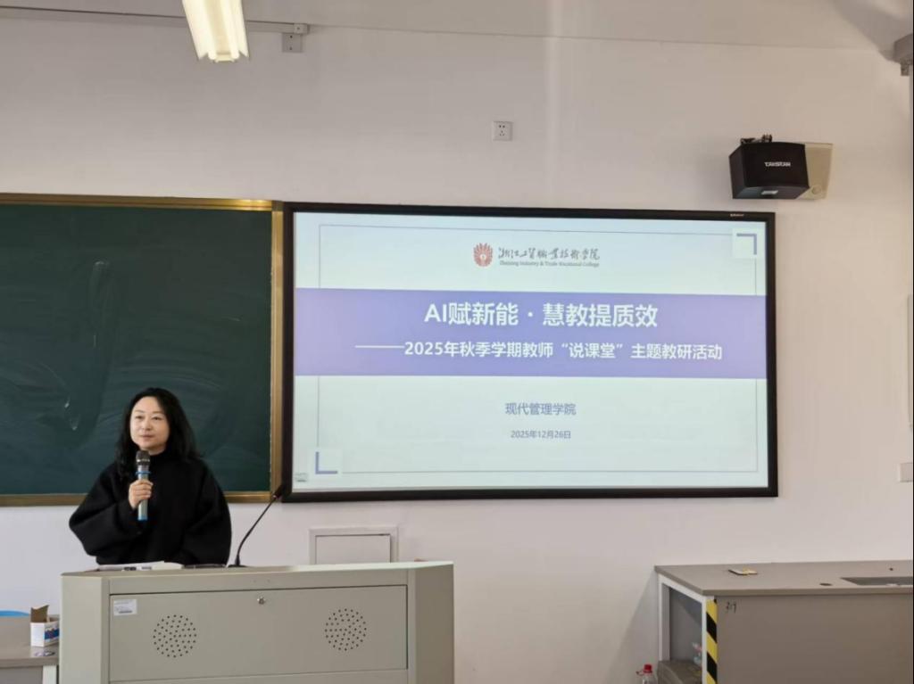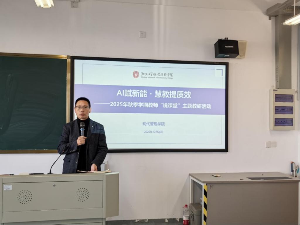 12月26日,现代管理学院举办“AI赋新能・慧教提质效——人工智能驱动课堂教学创新实践”2025年秋季学期教师“说课堂”主题教研活动。学院院长王国银、副院长孙富山、副院长朱秀清、党总支副书记贾飞祥及旅游管理专业罗冬梅老师担任评委,各专业(教研室)教师参与活动。