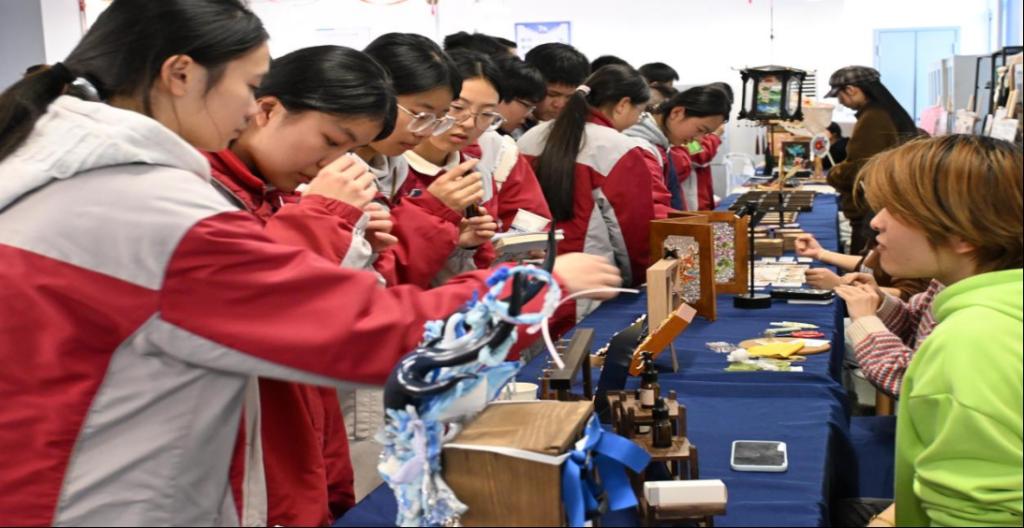 茶艺展示区以春夏秋冬为主题铺展茶席,素雅茶服与精致茶具相映成趣。学子们依循专业流程,流畅完成温杯、置茶、注水、出汤等一系列茶艺操作,动作规范优雅。茶汤入杯时茶香袅袅,瞬间弥漫整个展厅,尽显旅游服务专业的礼仪素养与实操能力。与之相对的围炉煮茶体验区暖意融融,参观者围坐炉边煮茶闲谈,沉浸式感受文旅融合的闲适氛围。
