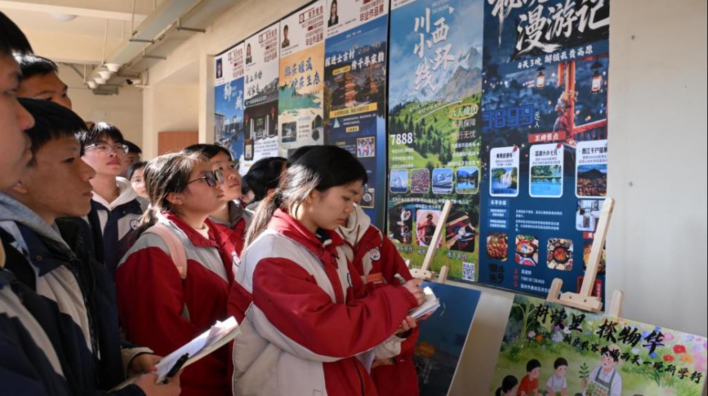 直播区内同样热闹非凡,学生们化身主播介绍各个展区并配合生动讲解,以新媒体视角展现旅游专业学子的设计成果。