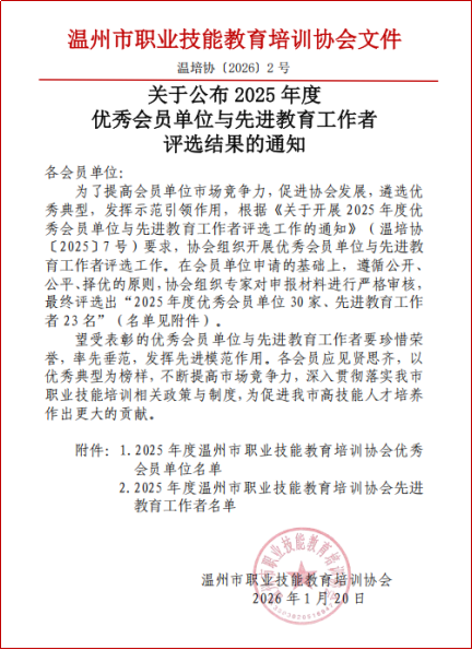 2026年1月20日,温州市职业技能教育培训协会正式发布2025年度优秀会员单位评选结果,我校凭借卓越的培训成效、创新的教学模式以及持续的社会贡献,再次获评“优秀会员单位”称号。这是我校自2020年以来连续第六年荣获此项荣誉,不仅体现了协会对我校工作的高度认可,更彰显了学校在职业教育培训领域的深厚积淀与领先地位。