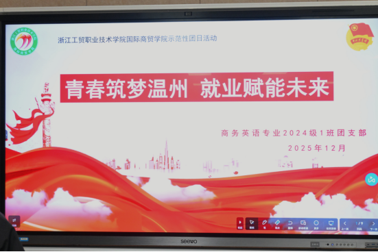 为响应“强城行动”号召,助力温州冲刺“双万”城市,打造“全省第三极”,2025年12月29日晚,国际商贸学院商务英语专业2024级1班团支部开展“青春筑梦温州,就业赋能未来”院示范性主题团日活动。国际商贸学院团总支书记周小倩、该团支部全体团员、24届各班团支书共同参与活动。