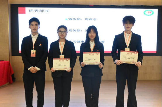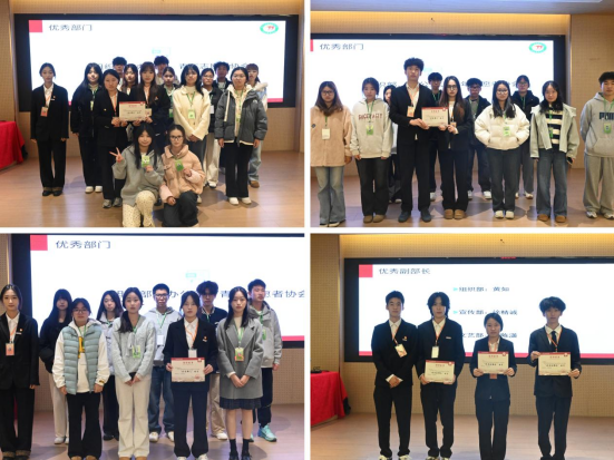 此外,大会还对本年度表现突出的优秀部门、优秀部长及副部长进行了表彰,其中组织部、办公室、青年志愿者协会荣获“优秀部门”称号;周彦君、王睿霖、张凌雪获评“优秀部长”;黄如、徐精诚、郭陈潇获评“优秀副部长”。表彰现场掌声不断,既是对获奖者过往努力的肯定,更是对全体团学成员未来奋进的激励。