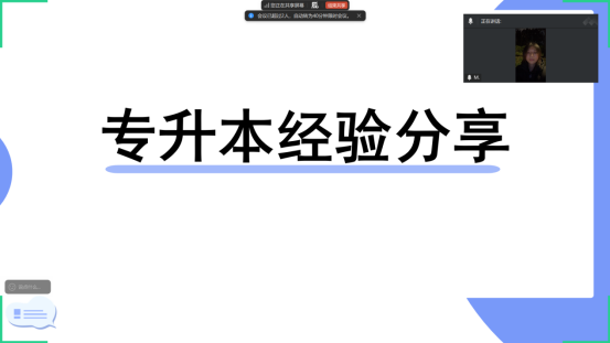 在专升本经验分享环节,电商2201班毕业生马淇炫校友,以自身考入浙江工商大学旅游管理专业的经历为蓝本,通过线上屏幕演示、案例讲解,从专业选择、备考规划、高效学习方法三方面细致分享。她结合国际商贸学院专业基础,讲解如何根据自身优势选择适配专业,分享阶段性备考、知识点梳理、真题演练、错题复盘等技巧。针对备考压力,她分享了心态调节、时间分配、同伴互助的方法,鼓励学弟学妹坚定信念、持之以恒。