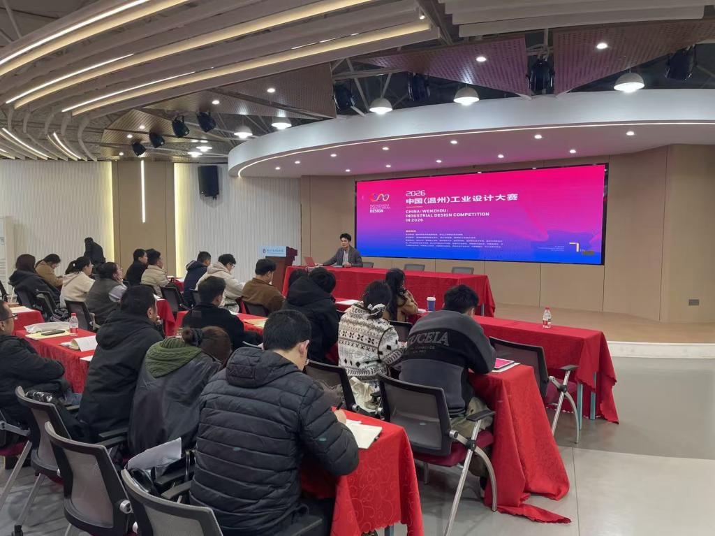 下午培训结束后,由温州市经济和信息化局、浙江工贸职业技术学院主办的2026中国(温州)工业设计大赛组委会工作人员余明亮为在场学员做专题宣讲,详细介绍了大赛背景,评比标准,参赛价值,奖项设置,报名方式,并对往届获奖作品进行解析,并鼓励大家积极参与参加这次比赛,借助大赛平台展现创意才华,为温州设计力量增光添彩。