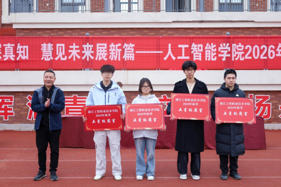第三项议程:颁奖仪式。洪长存副书记宣读2025年度在各类专业竞赛、学业发展、班级建设、宿舍管理中表现突出的集体和个人获奖名单,并对获奖代表予以表彰。现场依次表彰了:浙江省大学生科技竞赛获奖代表、2025年度三好学生代表、优秀学生干部代表、先进班级代表、五星级文明寝室代表。获奖代表们登台领奖,现场掌声阵阵,这份荣誉不仅是对获奖者努力的肯定,更为全体学子树立了学习榜样,激发了同学们争先创优、奋勇拼搏的学习热情。