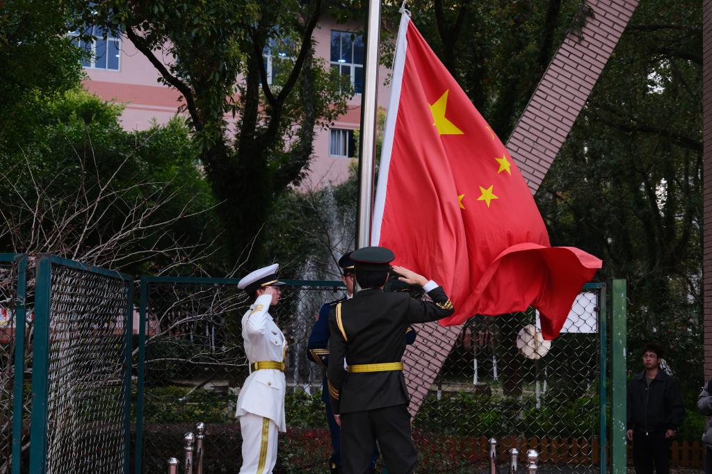 大会伊始,雄壮的《中华人民共和国国歌》响彻操场,全体师生肃然伫立、齐唱国歌。