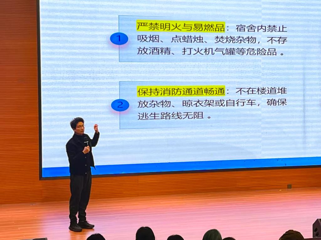 随后,季主任聚焦寝室安全管理与文明建设,围绕用电规范、消防安全两大核心,剖析违规使用大功率电器、私拉乱接电线等行为的安全隐患,强调“小事关乎安全,细节决定成败”,要求寝室长切实履行“第一责任人”职责,带头排查寝室用电风险,对电吹风、电热毯等违规电器做到“零容忍”,同时组织室友熟练掌握消防器材使用方法、牢记逃生疏散路线,常态化开展安全自查,切实筑牢寝室安全防线。在文明寝室创建方面,他详细解读评选标准,从内务整理、氛围营造、集体活动等维度明确评分细则,鼓励各寝室以评比为契机,将“整洁有序”内化为日常习惯,把“团结友爱”融入相处细节,打造各具特色的寝室文化,展现当代大学生积极向上的精神风貌。